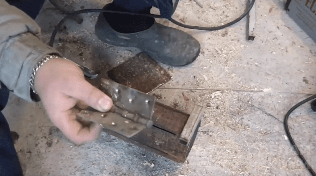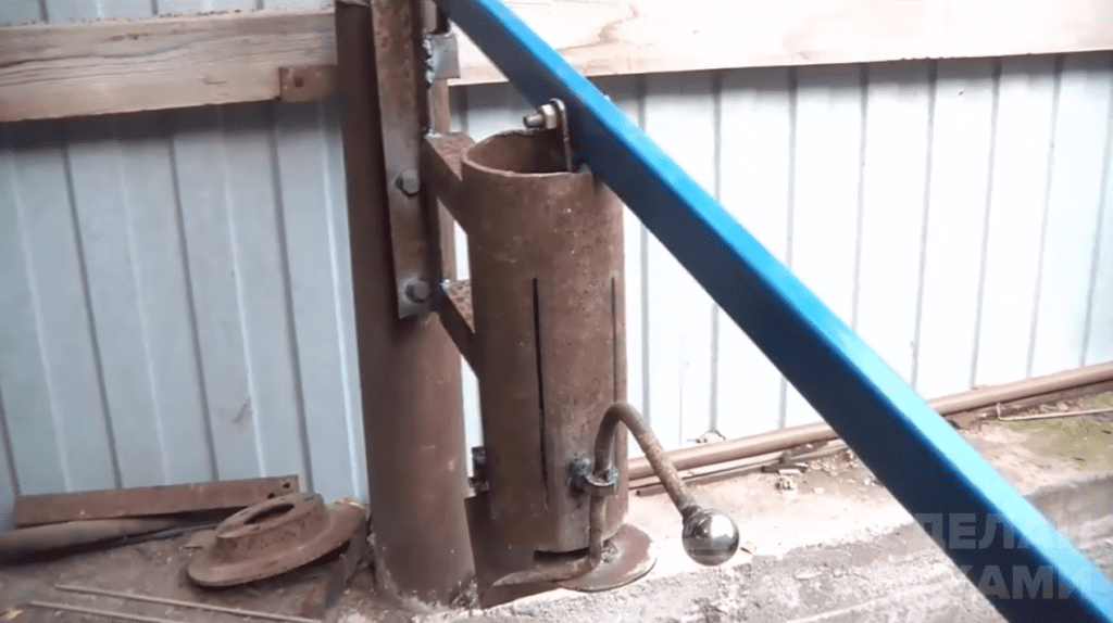 К нижней части трубы присоединяем отрезок профиля, на котором будет держаться дверная петля, соединяющая трубу с заглушкой. Петлю можно приварить или посадить на саморезы.