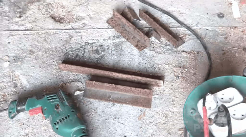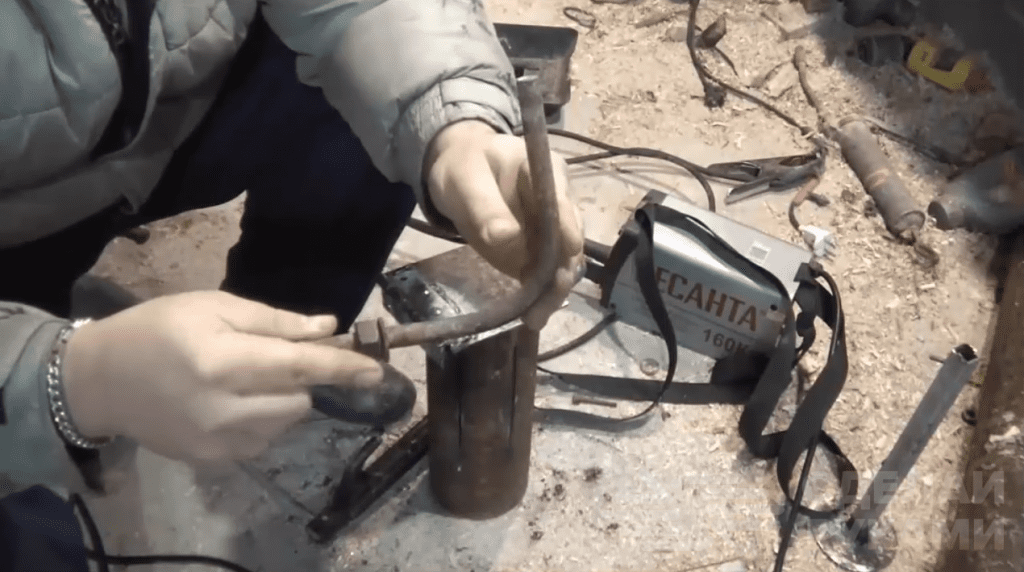 Первым делом отрезаем болгаркой кусок трубы (примерно 30 см), делаем в нем прорези для стока жидкости. Далее из куска листового металла толщиной 3-4 мм вырезаем круглую «давилку» (чтобы она была по диаметру трубы) и квадратную заглушку. К диску привариваем стойку из профиля под прямым углом.