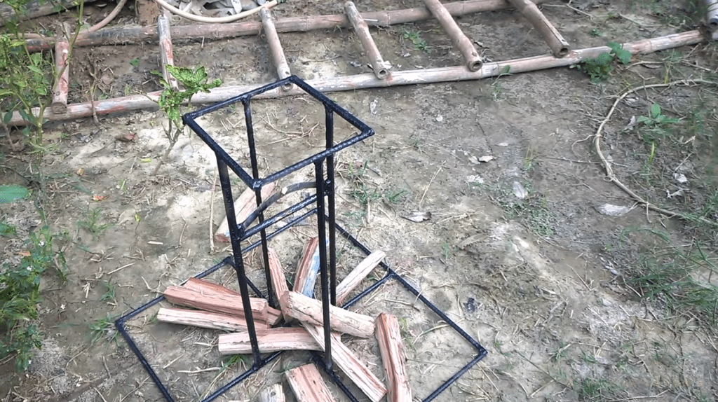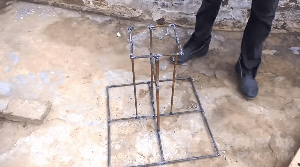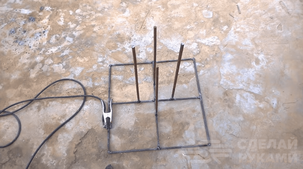 На следующем этапе работ привариваем к основанию четыре вертикальные стойки. Сверху на них надеваем маленький квадрат, сваренный из арматуры, и фиксируем его прихватками. Затем надо приварить поперечину между двумя вертикальными стойками (на расстоянии 15-20 см от верхнего края).