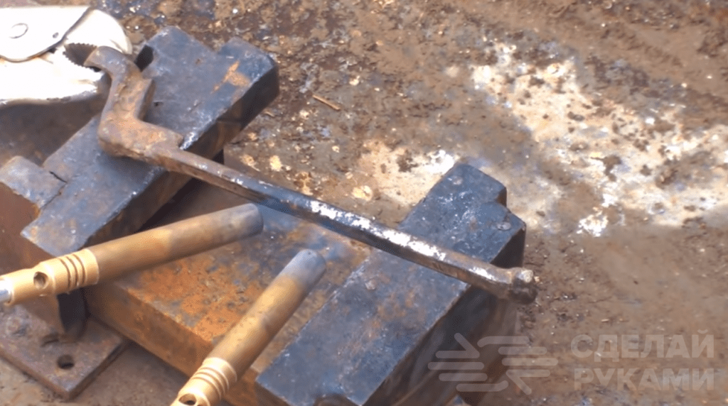Далее нужно будет изготовить нож, который и будет колоть дрова. Для этого будем использовать старый накидной ключ. При помощи газовых горелок нагреваем его посередине докрасна, чтобы придать изогнутую форму. После этого затачиваем изогнутую часть и отрезаем лишнее болгаркой.