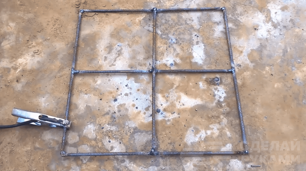 Первым делом необходимо сварить основание дровокола. Для этого отрезаем четыре арматурины одинаковой длины, и свариваем их между собой под прямым углом, чтобы получилась квадратная рамка. Внутрь вставляем крестовину из двух кусков арматуры и также обвариваем.