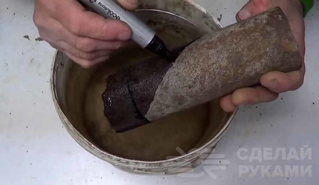 В первую очередь автор делает разметку и отрезает кусок круглой трубы под углом примерно 30-35 градусов. В итоге получился приемный бункер для рассады.