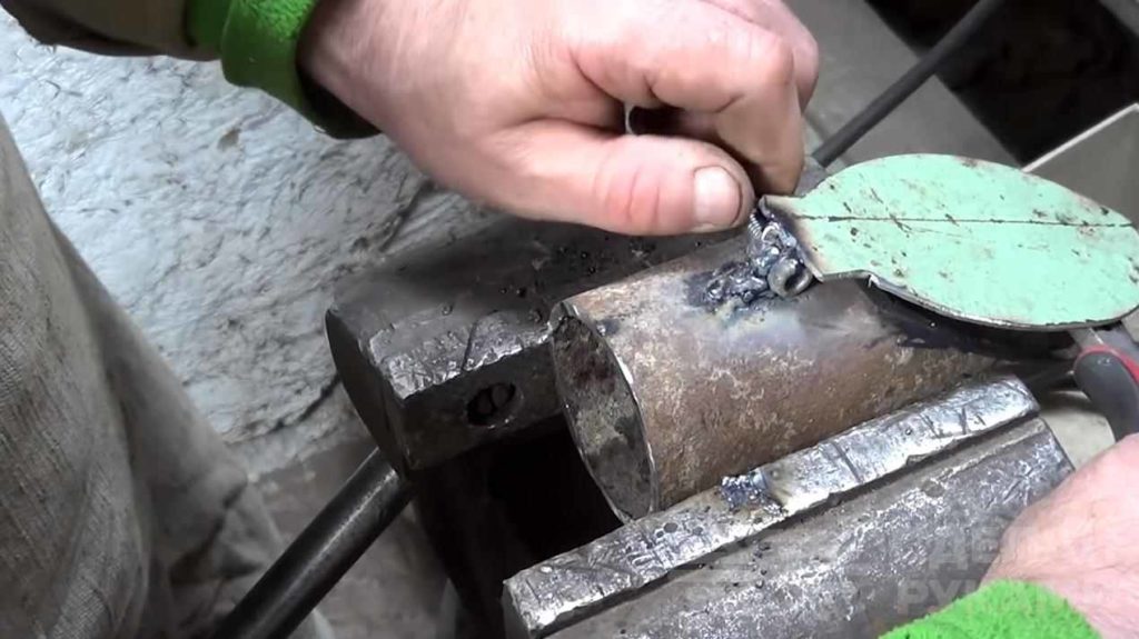Для этого из болта и трех гаек автор делает шарнирное соединение. Одна гайка приваривается к трубе, две — к заготовке.