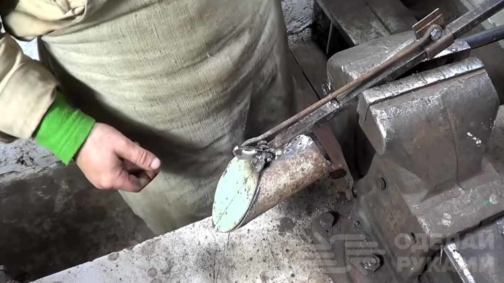 На следующем этапе необходимо будет вырезать из куска металлической пластины заготовку овальной формы. И ее надо прикрепить к трубе таким образом, чтобы она могла свободно открываться и закрываться.