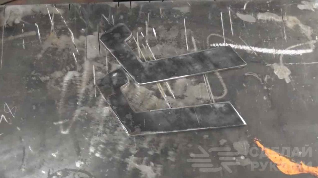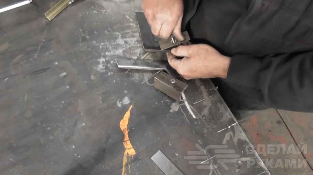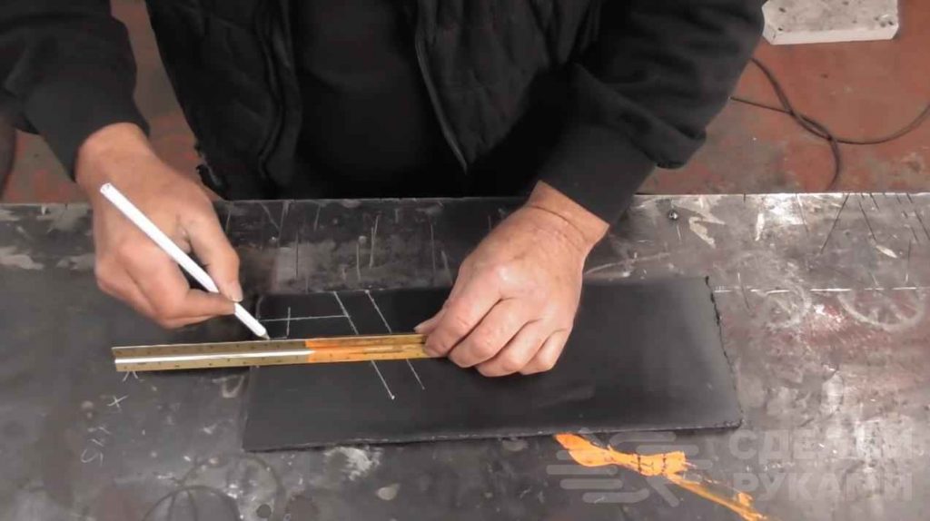 В первую очередь, мастер делает разметку на металлической пластине, чтобы потом можно было вырезать две одинаковых детали для сборки самодельного приспособления.