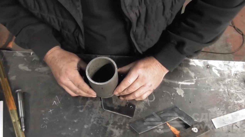 Для данной самоделки потребуется две детали, вырезанные из металлической пластины, а также два отрезка стальной трубы разной длины (одна длинная, вторая — коротка).