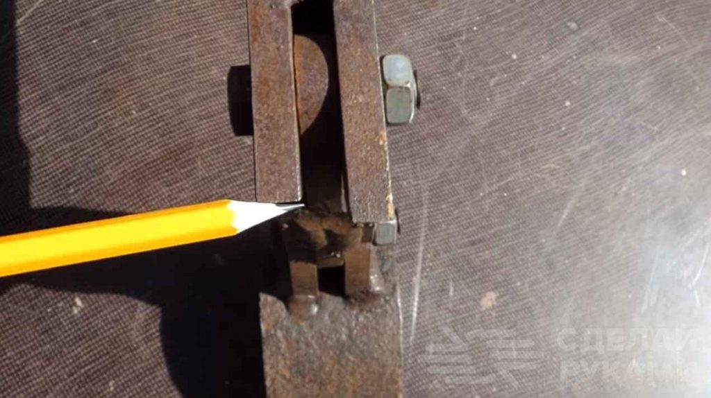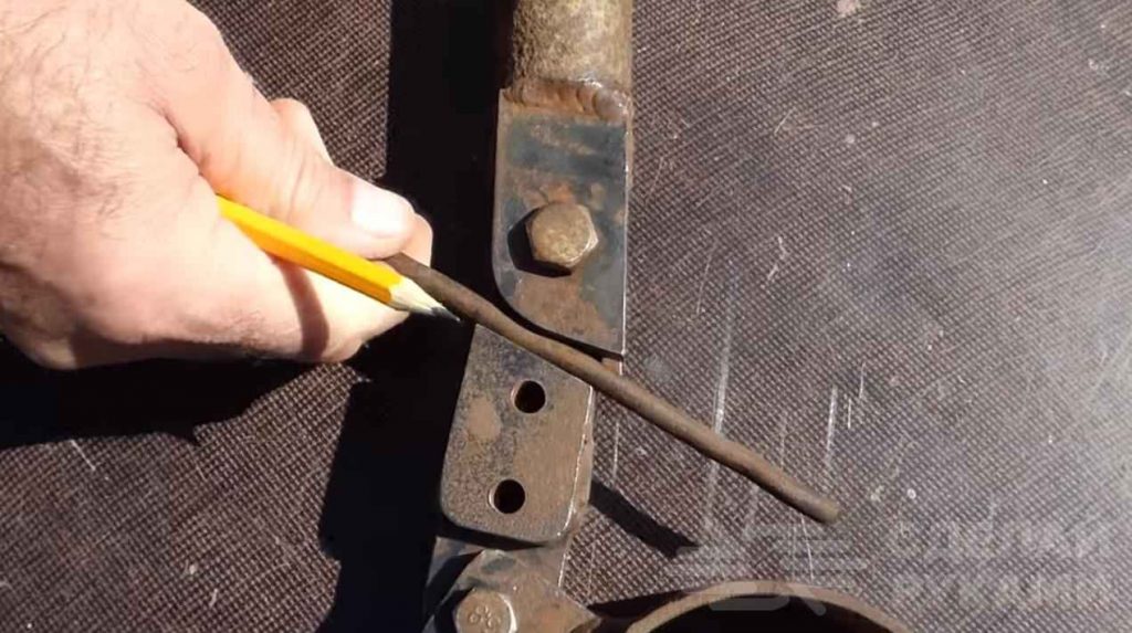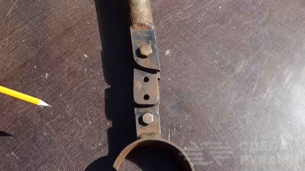 Второй шарнир приварен к рукоятке, и имеет две губки. При этом обратите внимание, что губки немного отличаются по длине. Предназначены они для зажима проволоки, которую надо будет натянуть между столбами.