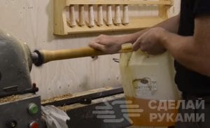 Первым делом вырезаем из доски брусок нужных размеров. Затем обрабатываем заготовку на токарном станке, придавая ей нужную форму (что-то похожее на бейсбольную биту).
