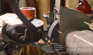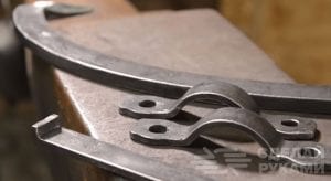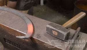 Из стальной пластины толщиной 10 мм и шириной 2,5 см необходимо изготовить крюк, чтобы кантовать бревна. Для этого нагреваем пластину докрасна и придаем ей нужную форму. Помимо этого, потребуется изготовить двусторонний хомут (из двух половинок) и костыль.