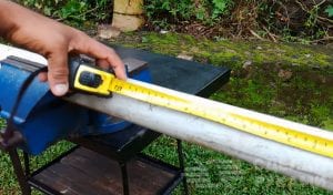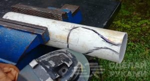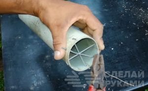 От пластиковой трубы нужно отрезать болгаркой или ручной ножовкой отрезок длиной примерно 12–15 см, в котором затем вырезаем отверстие каплевидной формы (контуры можно начертить от руки). Далее при помощи электродрели сверлим сквозные отверстия с обеих сторон трубы.