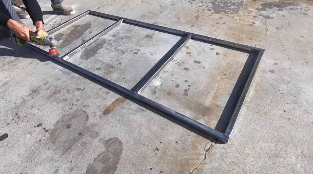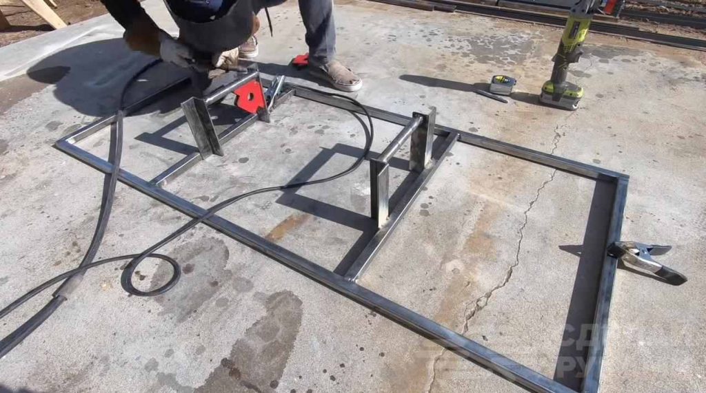 На следующем этапе необходимо приварить к каркасу ручки. Чтобы их сделать, потребуется два куска круглой трубы и четыре отрезка строительного уголка. Перед сваркой детали нужно будет зачистить болгаркой.