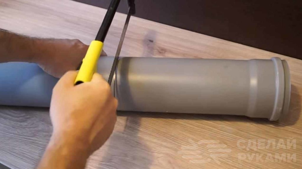 В первую очередь от пластиковой канализационной трубы диаметром 110 мм необходимо будет отрезать кусок длиной около 30 см. Для этого автор использует ручную ножовку по металлу.