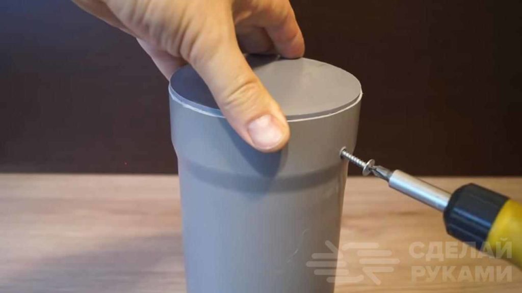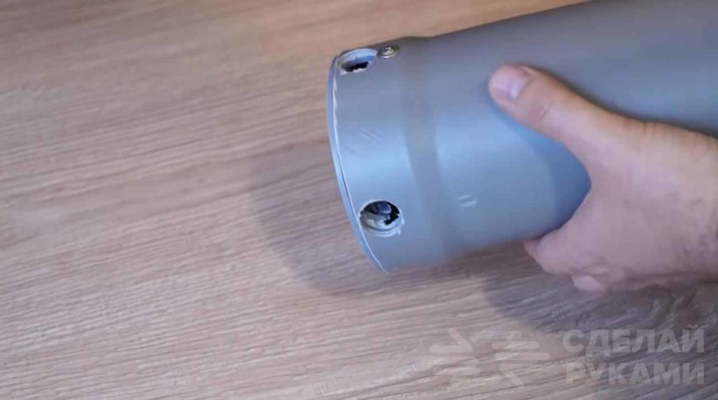 В пластиковую трубу автор вставляет заглушку, сверлит два отверстия и прикручивает ее на саморезы. Заглушка должна быть пластиковой.