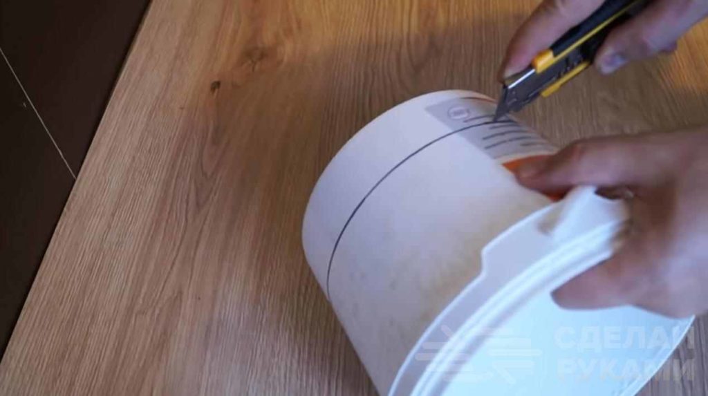 После этого отрезаем канцелярским ножом нижнюю часть пластикового ведерка. Это будет емкость («тарелка») для корма, из которой домашние птицы будут клевать зерно. По центру нужно просверлить отверстие.