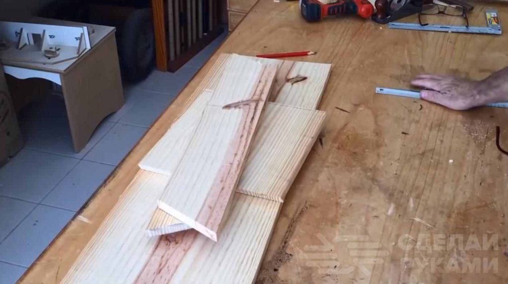 Первым делом потребуется отпилить одну длинную доску, одну короткую и парочка узких досок, отрезанных под углом 30 градусов.