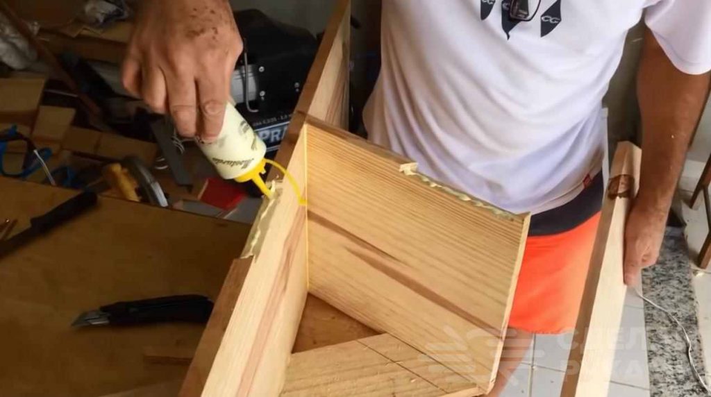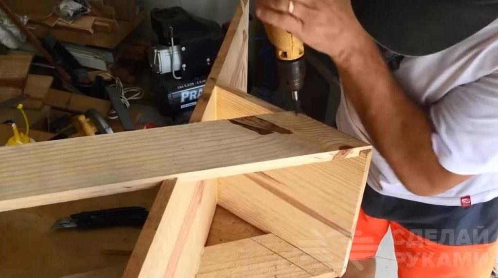 Две широких доски (длинную и короткую) нужно соединить друг с другом при помощи саморезов. И немного клея ПВА тоже не помешает.