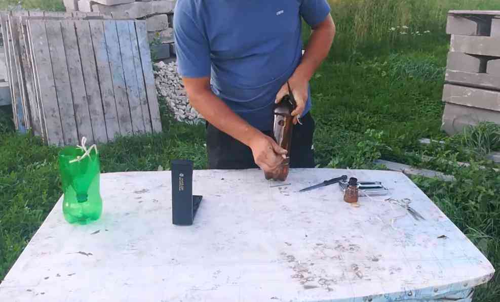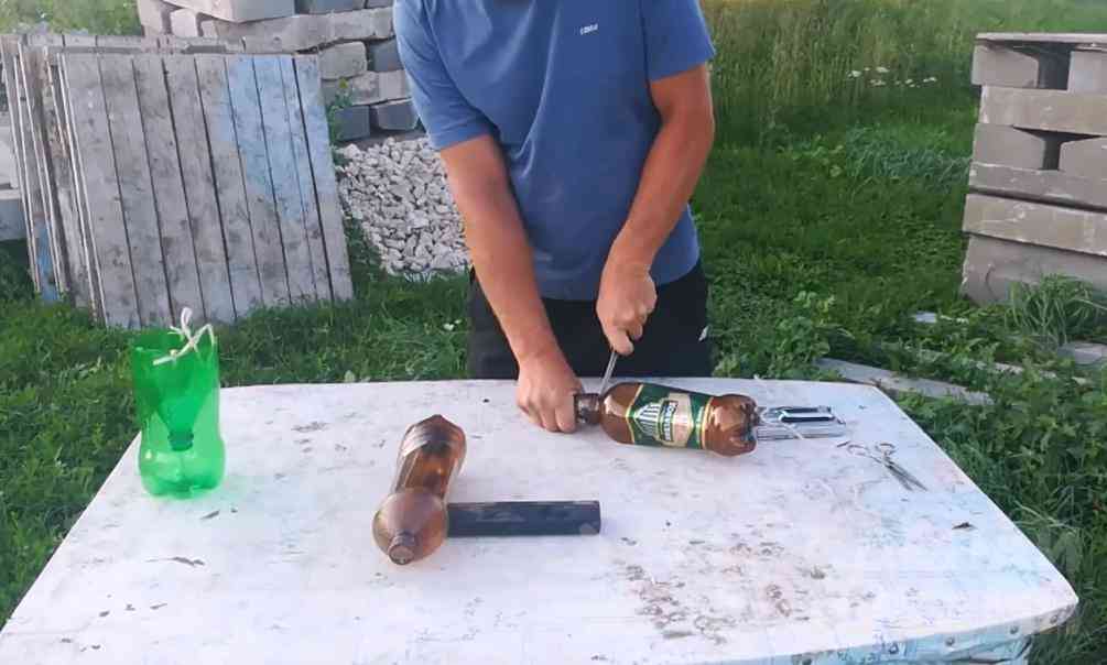 От одной бутылки нам потребуется только часть горлышка, а во второй нужно проделать отверстие под него. После этого вставляем горлышко в бутылку, и ловушка готова.