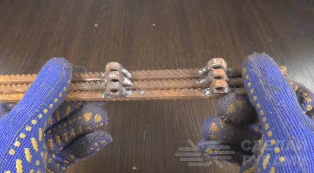 Также потребуется три куска арматуры диаметром 8 мм и длиной по 25-30 см и гайки диаметром 8 мм. К каждому куску арматуры нужно приварить по две гайки на расстоянии друг от друга.