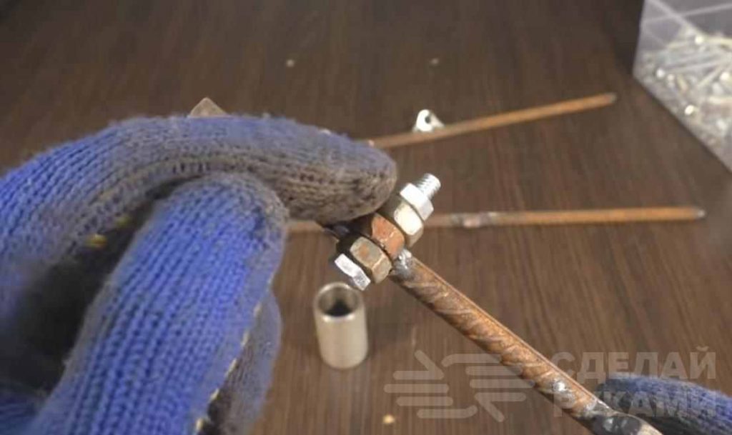 На следующем этапе автор берет болт М6, надевает на него гайку М8, потом продевает в гайку, которая приварена к арматуре, снова надеваем гайку М8 и фиксируем гайкой М6.