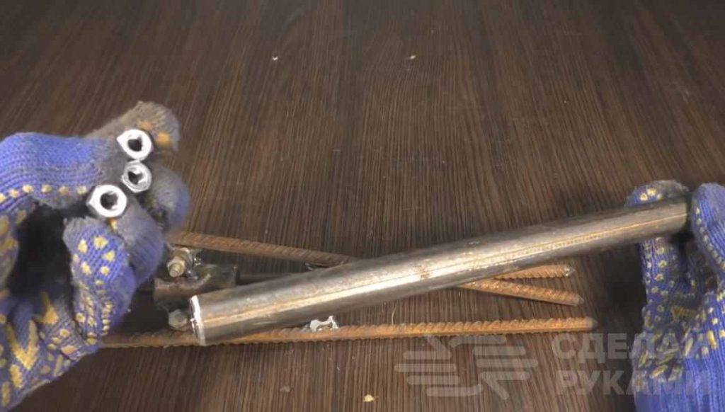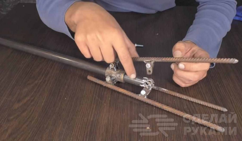 Затем нужно вырезать шесть кусочков пластин, просверлить в них отверстия и прикрепить их с помощью болтов к гайкам в нижней части прутков арматуры. Далее соединяем данные пластинки с гайками на полудюймовой трубе.