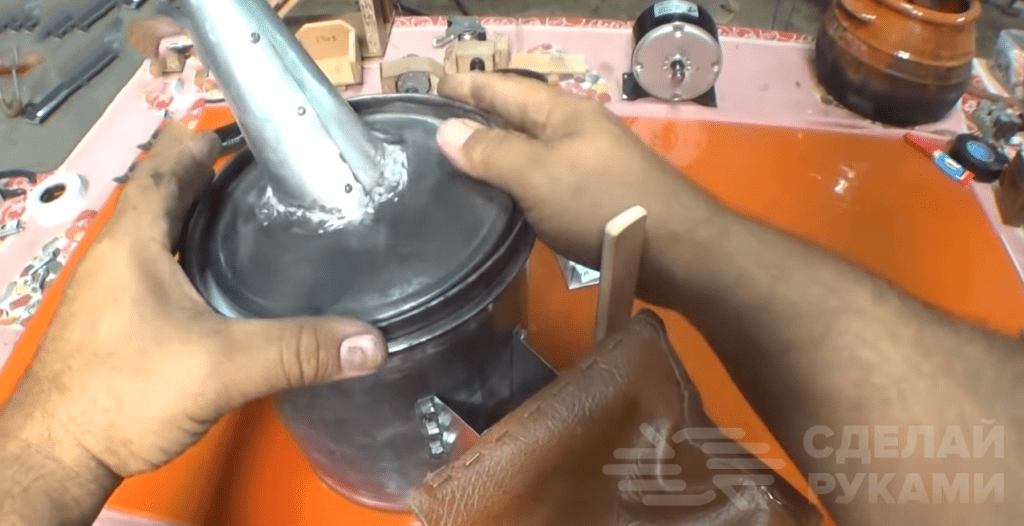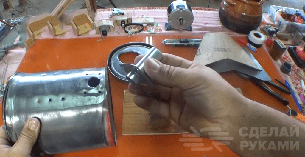 Первым делом необходимо сделать два сквозных отверстия: одно в крышке, второе — в емкости (в нижней части). Затем из листа нержавейки вырезаем кусок подходящей формы, чтобы можно было «скрутить» его в конус. В нижнюю часть ведерка вставляем кусок трубки (можно сделать из отрезка нержавейки).