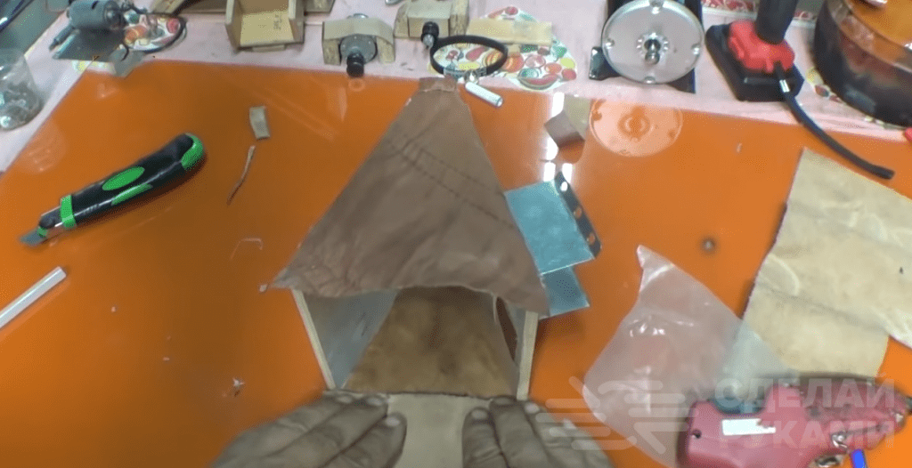Из двух дощечек фанеры, мебельной петли и кожи (или кожзаменителя) собираем устройство для нагнетания воздуха. Сначала соединяем заготовки между собой петлями, а потом к кромке крепим с помощью термоклея куски кожи.