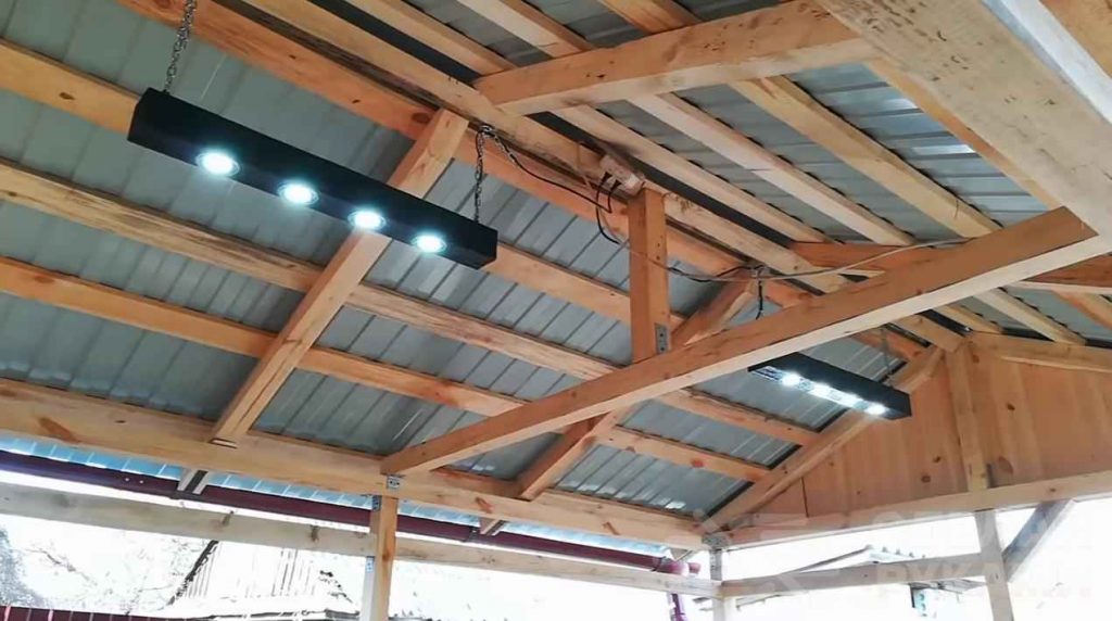 На последнем этапе работ брусок покрывается лаком (или можно просто пропитать маслом), после чего устанавливаются светильники и делаются подвесы.