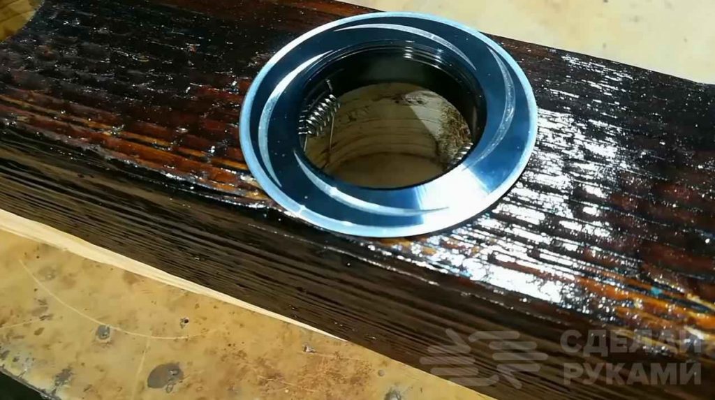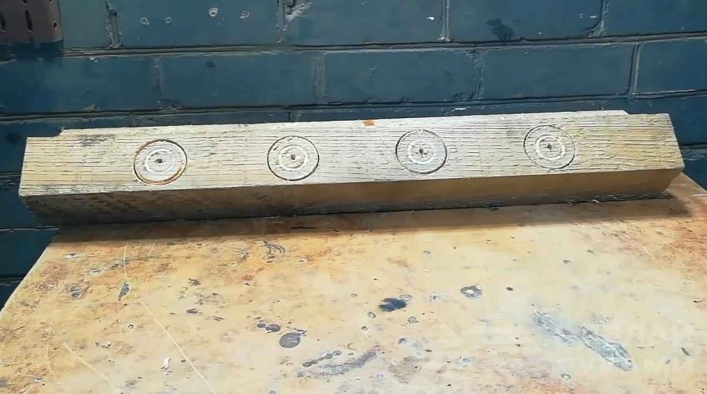 Далее в бруске нужно будет просверлить четыре «гнезда» под установку точечных светильников. Сделать это можно при помощи коронки по дереву подходящего диаметра.