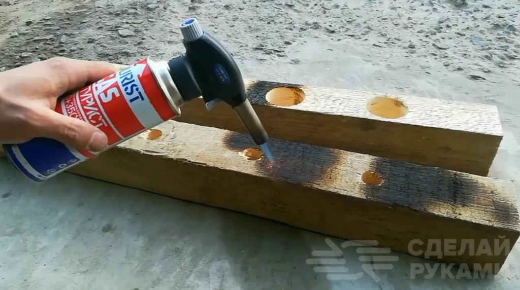 Чтобы сделать корпус светильник более стильным, мастер обжигает брусок газовой горелкой. Потом поверхность зачищается щеткой, которую обычно используют для очистки металла.