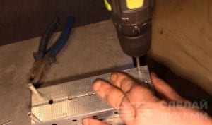 Если профиль кромсали ножницами по металлу, то необходимо подровнять края болгаркой или напильником. На двух отрезках профиля срезаем загнутые края, чтобы потом их можно было состыковать между собой. Сверлом диаметром 4 мм делаем отверстия под заклепки, которые будут удерживать ножки печки.
