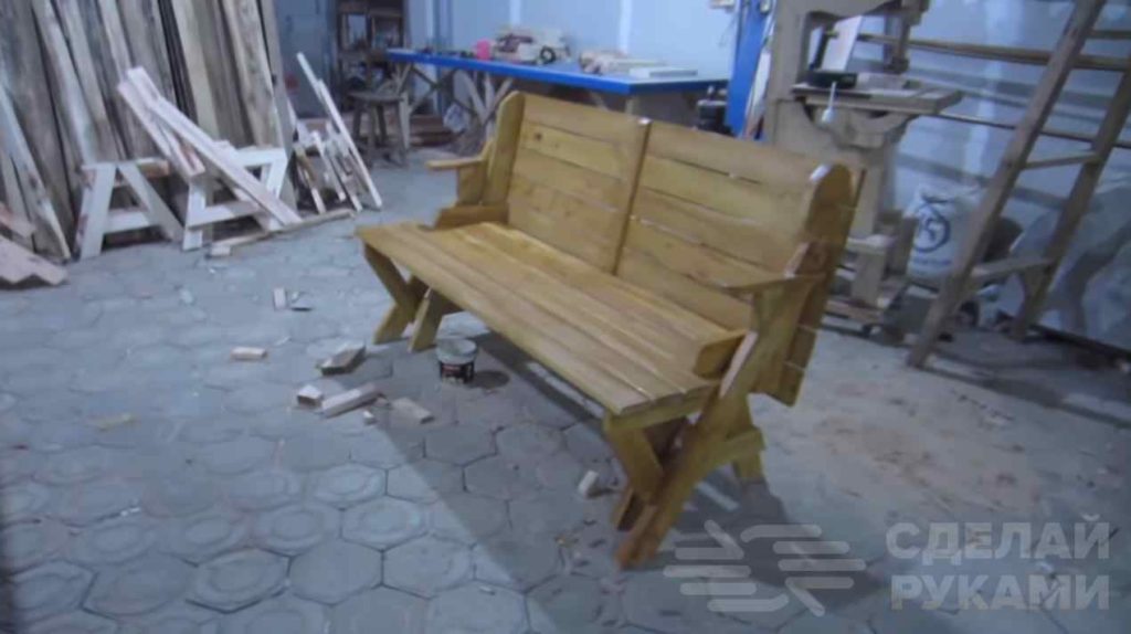 Собранную лавочку-стол тщательно ошкуриваем и покрываем при необходимости минеральным маслом.