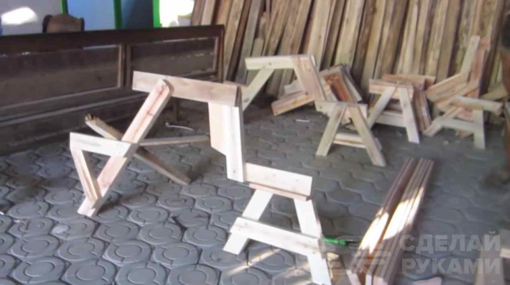Скручиваем их между собой внахлёст и торцами. Получаем фигуры по виду напоминающие букву «А». Это и будут ножки наших лавочек и столешницы.