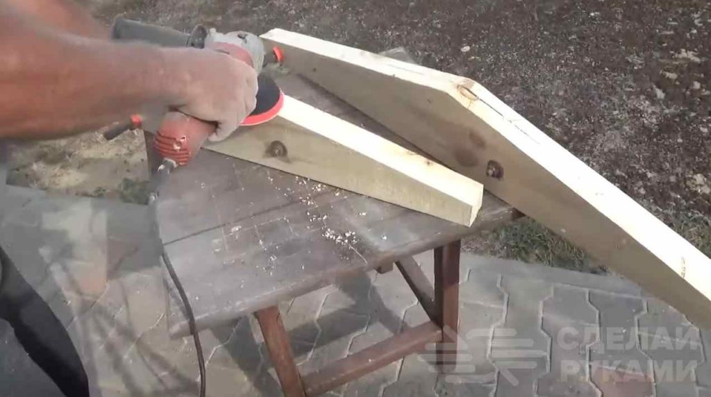 В ножках сверлим отверстия под болты, после чего нужно их отшлифовать. Автор использует для этого болгарку (УШМ) с лепестковым диском.