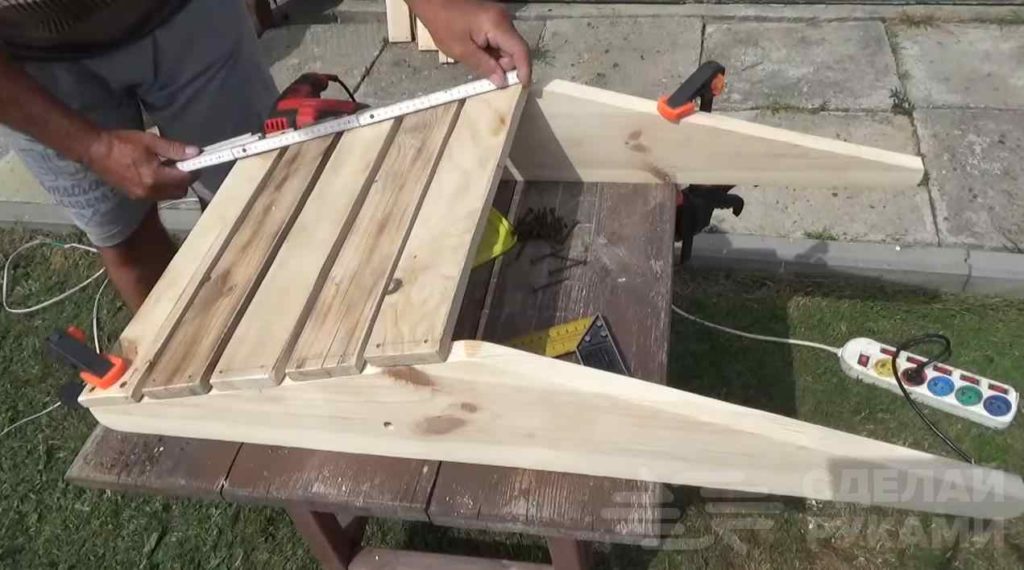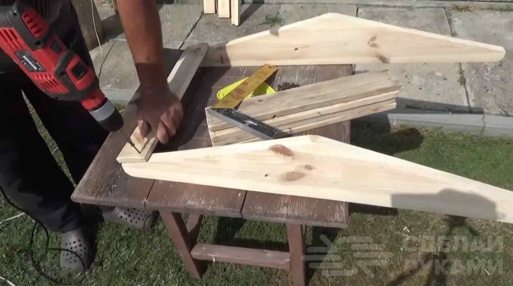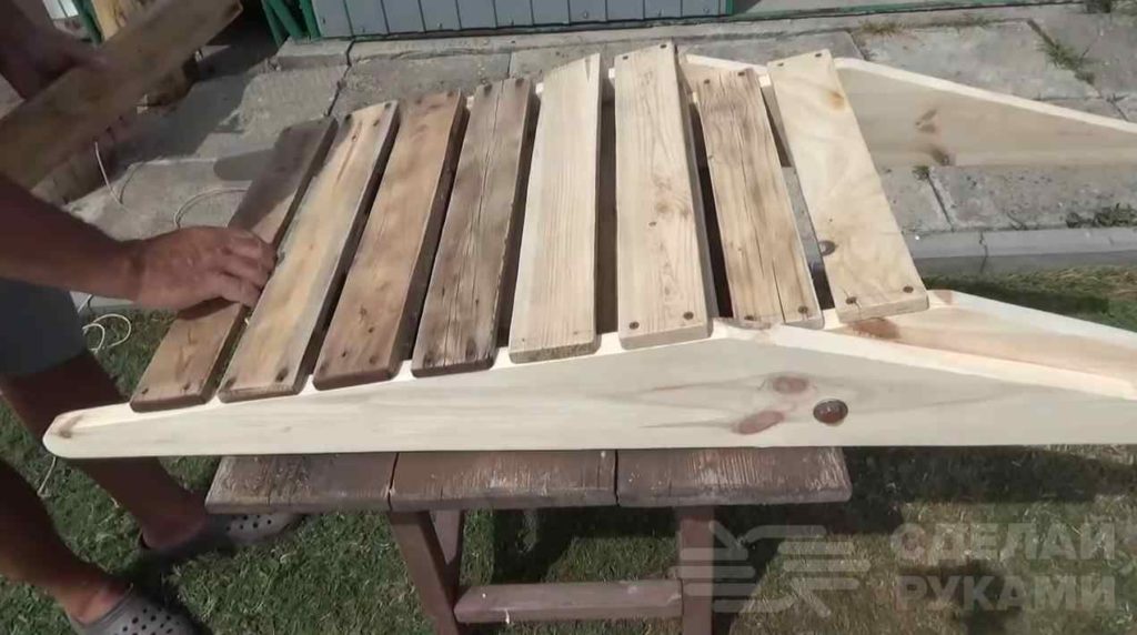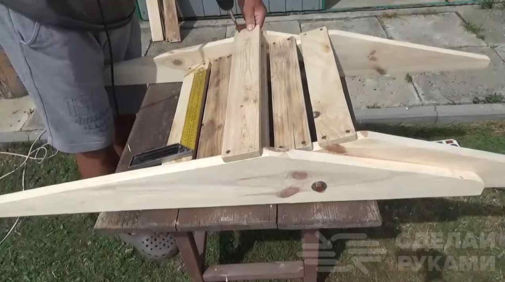 На следующем этапе необходимо будет подготовить доски прямоугольной формы. Прикручиваем доски на саморезы к первой паре ножек.