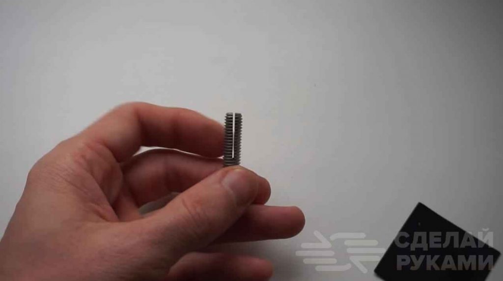 Первым делом необходимо сделать продольный пропил в «теле» болта. Сделать его можно с помощью ручной ножовки по металлу. Чтобы пропил получился ровным, мастер использует в данном случае деревянный шаблон.