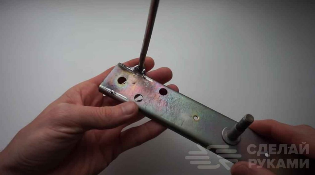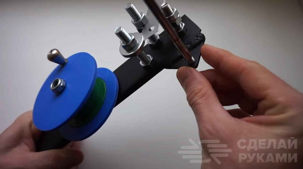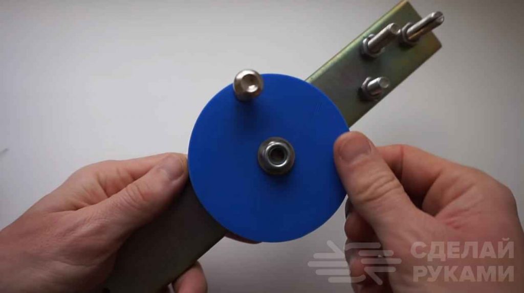 В металлической планке необходимо просверлить три одинаковых отверстия под установку болтов. Потом мастер вставляет болты в отверстия и фиксирует их гайками. Также на самой пластине крепится катушка для наматывания пластиковой ленты.