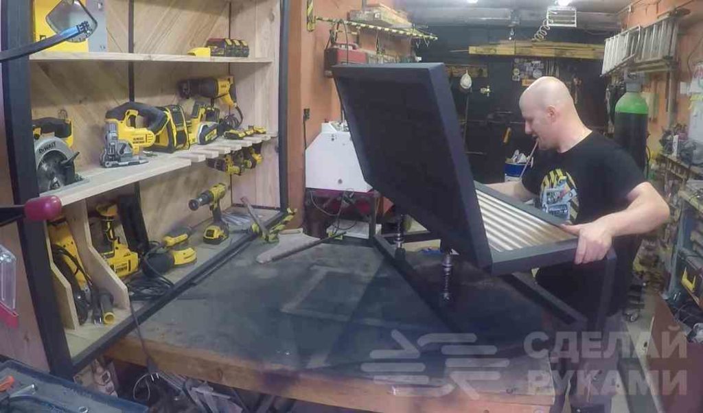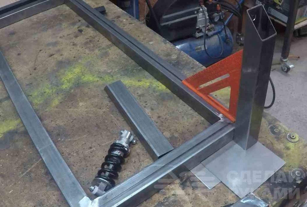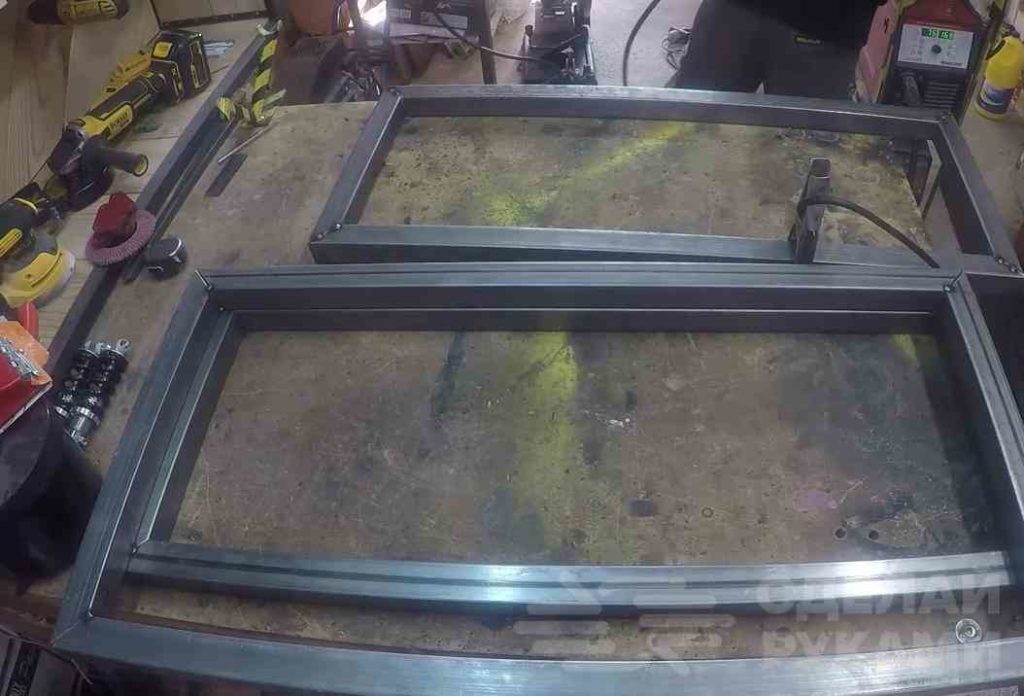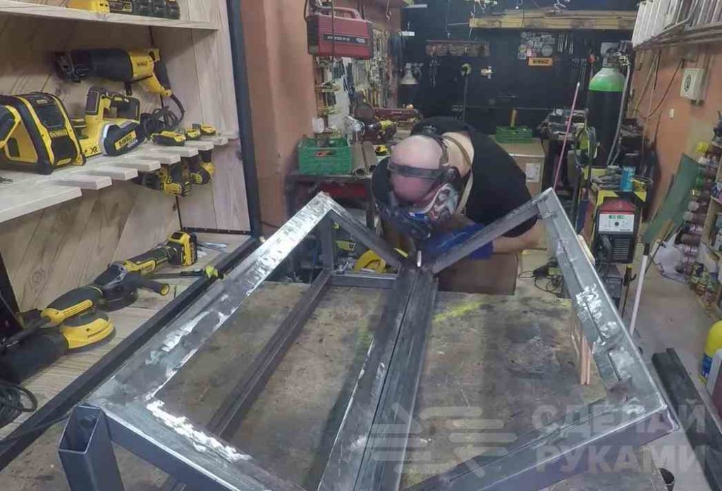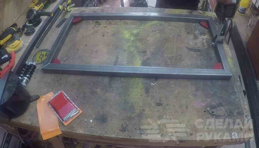 Для этого автор отрезает по размеру четыре куска профильной трубы, и сваривает их вместе. В итоге должна получится прямоугольная рамка.