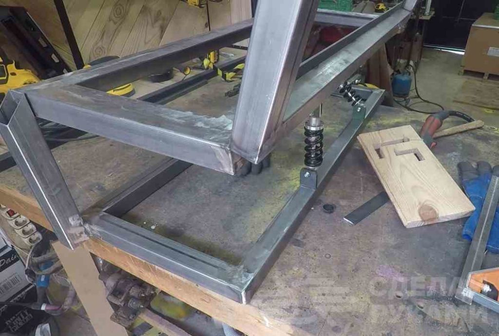 После этого к каркасу сиденья и основания скамейки надо будет приварить крепления для амортизаторов.