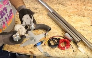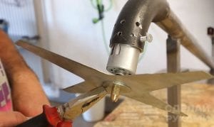 Из квадратного профиля и куска пластины надо сварить крепление для колес, которое крепится к нижней части трубы. Устанавливаем двигатель, соединяем провода с аккумуляторной батареей и переключателем и крепим колесики. На последнем этапе устанавливается четырехлепестковый режущий нож и защитный кожух из листовой стали.
