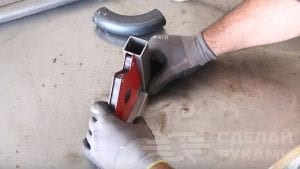 Начнем со сварочных работ. Первым делом нужно сварить между собой два отрезка квадратного профиля под прямым углом, а затем — круглую трубу с отводом на 30 градусов. Далее к верхней части круглой трубы нужно будет приварить получившуюся Г-образную деталь из профиля.