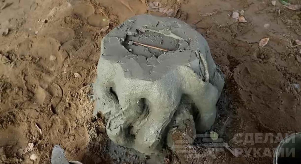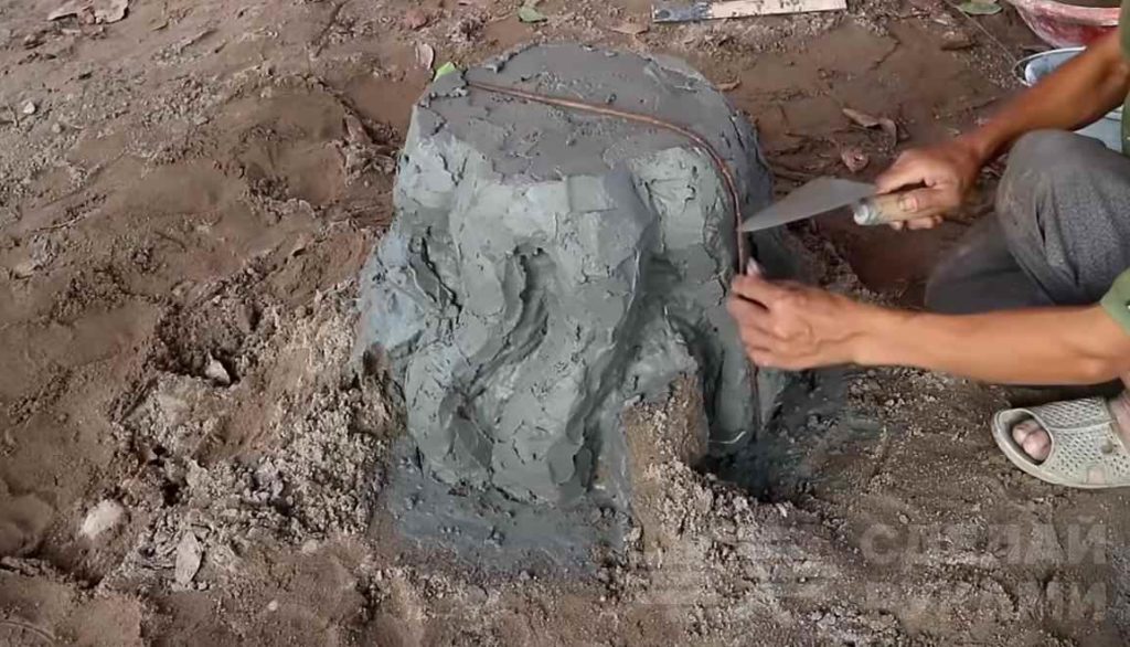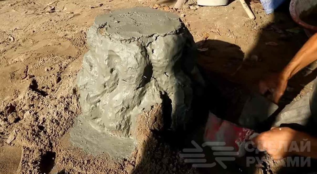 На следующем этапе замешиваем цементно-песчаный раствор, и начинаем аккуратно обмазывать форму. Самый первый базовый слой и вовсе можно сделать жидким раствором.