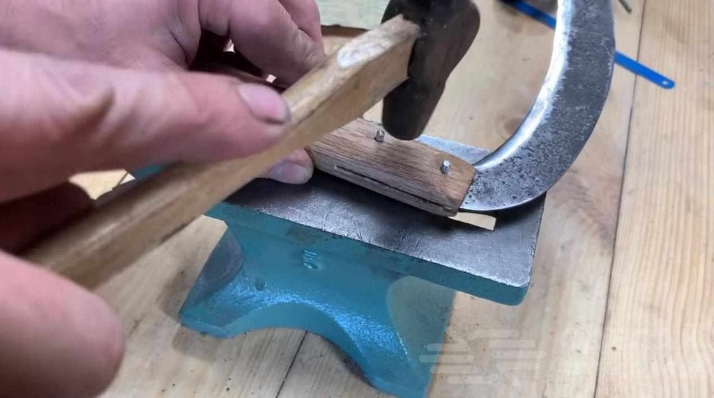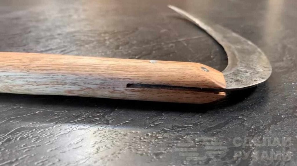 После закалки следует отпуск в электрической духовке и финишная заточка лезвия. Ну а потом изготавливается деревянная ручка. Она соединяется с ножом косы при помощи заклепок. При желании косовище можно покрыть минеральным маслом.