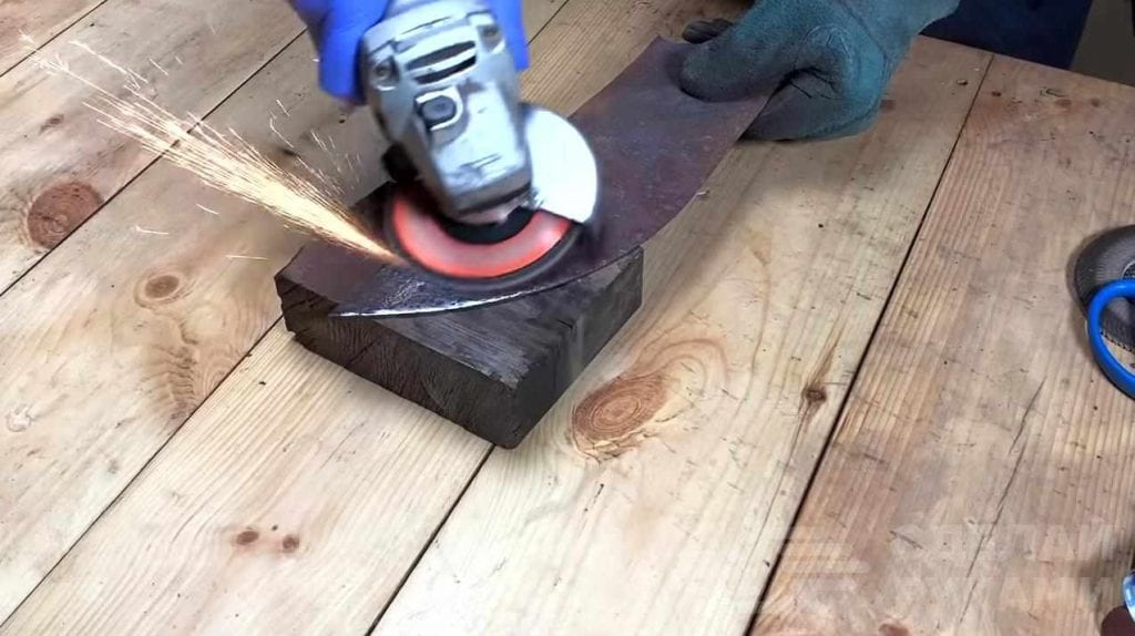 Первым делом мастер снимает лопату с держака и отрезает от нее чуть меньше половины — с одной лопаты получится две заготовки. Затем вырезанную часть необходимо будет нагреть при помощи газовой горелки и подровнять на наковальне. Далее мастер обрабатывает заготовку угловой шлифмашинкой.
