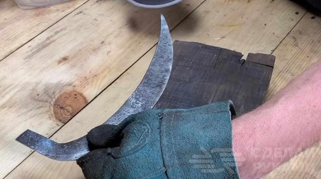 Обязательно нужно сделать закалку, чтобы коса-серпан была более прочной. Мастер нагревает косу докрасна и опускает ее в емкость с маслом. Перед закалкой необходимо просверлить два отверстия для соединения с деревянной ручкой.