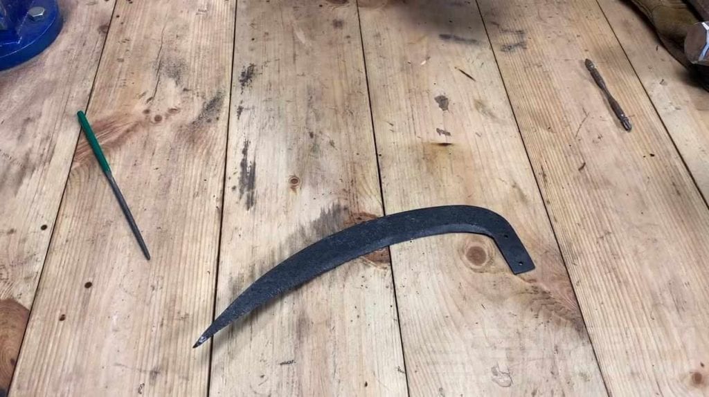 На следующем этапе автор придает заготовке необходимую форму, отрезая лишнее болгаркой. Лепестковым кругом он делает заточку косы.