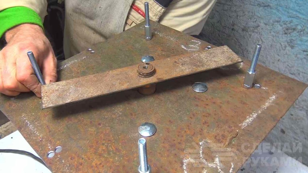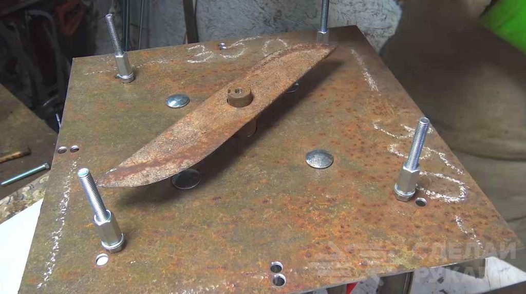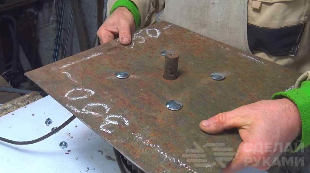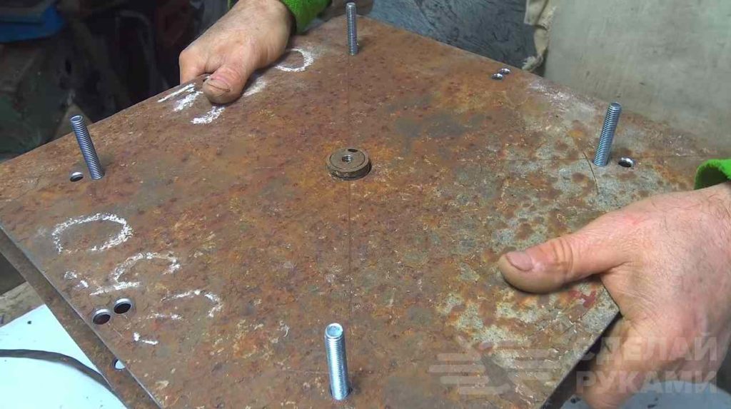 В первой пластине мастер сверлит крепежные отверстия под болты, а также одно центральное отверстие под вал двигателя. Крепим пластину к корпусу двигателя.