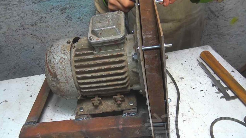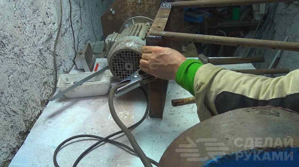 Из уголков необходимо сварить раму, на которой будет стоять электродвигатель. К ней автор приваривает ножки из круглой трубы.