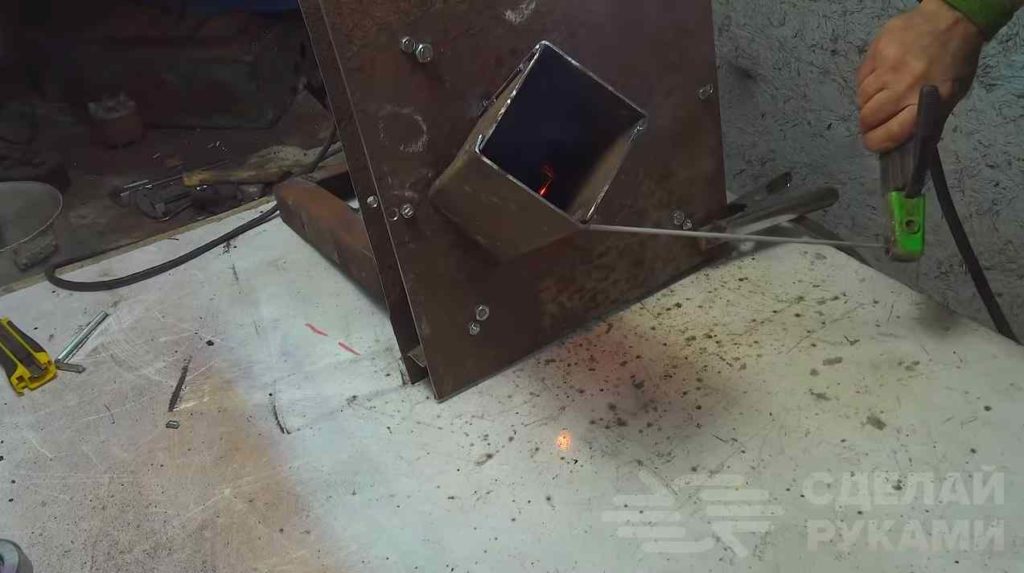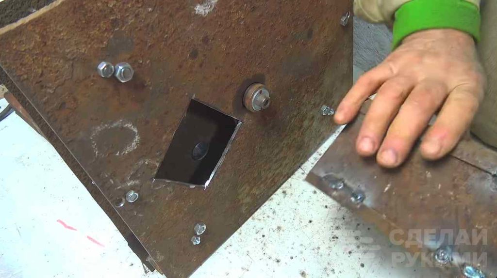 На следующем этапе мастер вырезает квадратное окно во второй пластине, чтобы приварить приемный бункер. Можно сварить его из кусков металла или использовать квадратную профильную трубу.