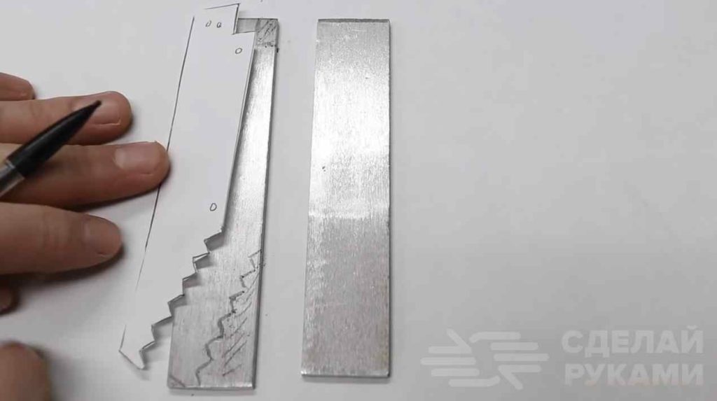 Первым делом автор отрезает две металлических полосы подходящей длины. Прикладываем к полосам подготовленный бумажный шаблон и обводим его маркером.