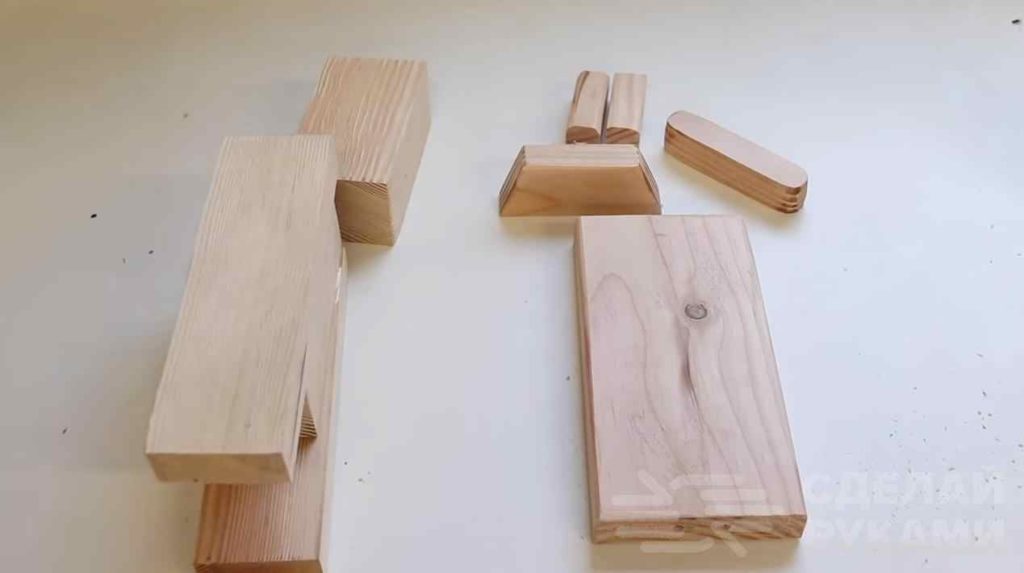 На следующем этапе из обрезков доски и брусков мастер выпиливает заготовки необходимой формы. Склеиваем все детали вместе, после чего размечаем и сверлим отверстия в нужных местах.